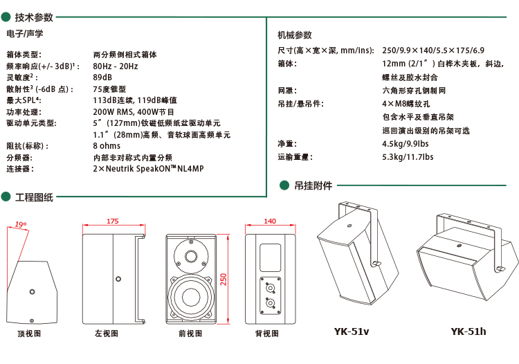 小型的箱體由12mm(1/2″)多層樺木制成,包含一個5″(127mm)低頻紙盆驅動單元匹配到錄音棚級別的1.1″(28mm)軟球頂高頻元。如您所希望的,EM Acoustics的內部內置分頻免除了昂貴的非必要的外部處理。揚聲器提供雙Neutrik SpeakONTM 輸入并有四個M8螺紋孔用于吊掛,還有六角形穿孔網罩保護驅動單元在運輸時免受損傷。為了方便操作,EMS-51發貨時配有固定安裝級別的水平及垂直安裝架,以及可選的巡回演出級別安裝硬件可供選擇。